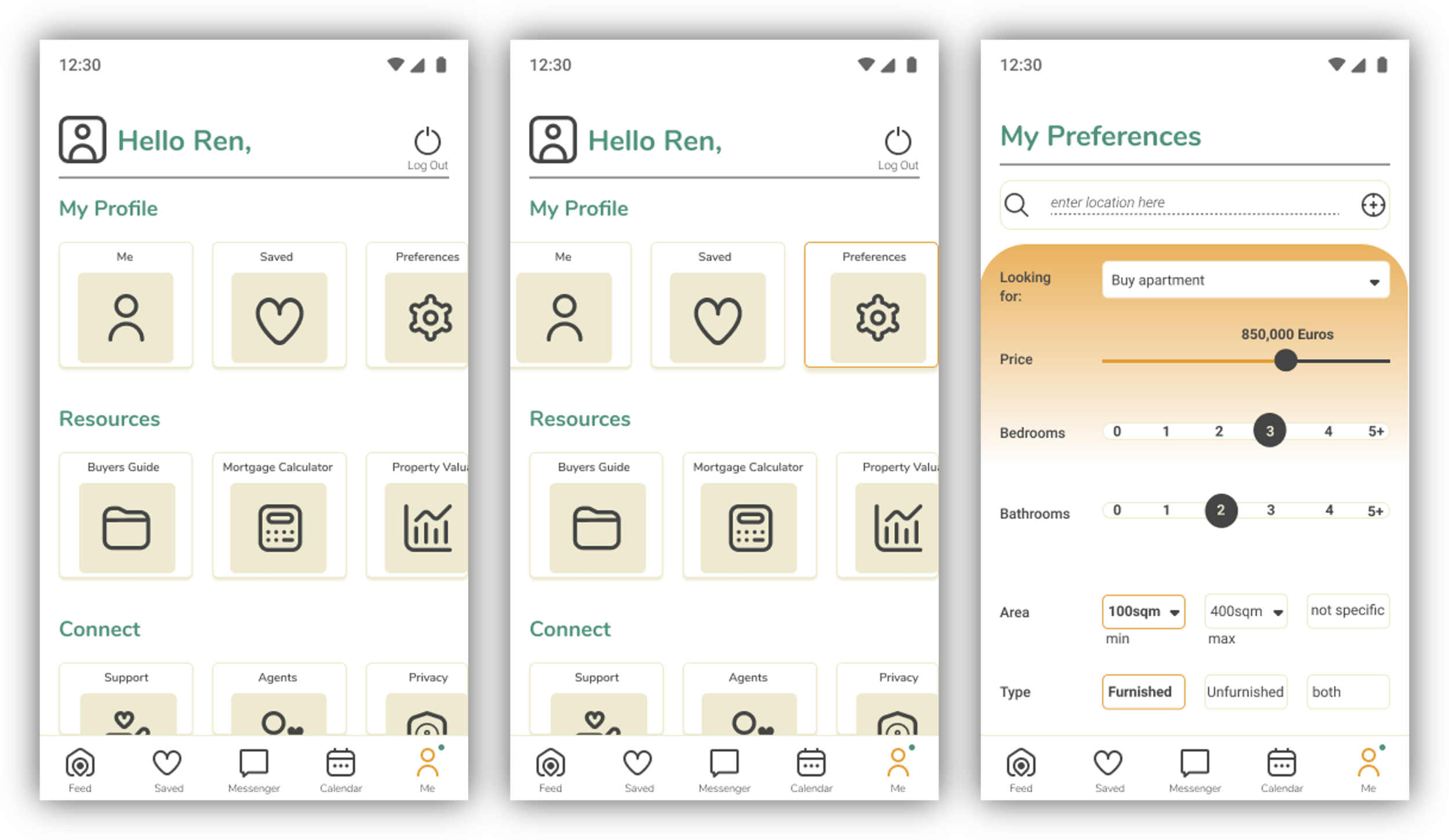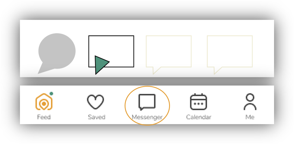 For the bottom navigation bar, I created a messenger icon where customers can view/save their conversation history with potential property sellers and track confirmation emails for their appointments.
